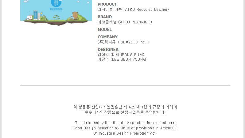 ATKO planning은 지속가능한 가죽 소재 개발을 위하여 천연 재생 가죽부터, 전 세계 최초의 가죽 실 등 다양한 소재를 개발하고 있는 친환경 소재 기업입니다. ATKO planning의 친환경 소재 기업이라는 아이덴티티 확립을 위한 리브랜딩 작업을 Sexyzoo와 함께 진행하게 되었습니다. Sexyzoo에서는 ATKO planning의 기업 철학을 바탕으로 홍보영상, 시각 홍보물 및 홈페이지를 제작하였습니다.