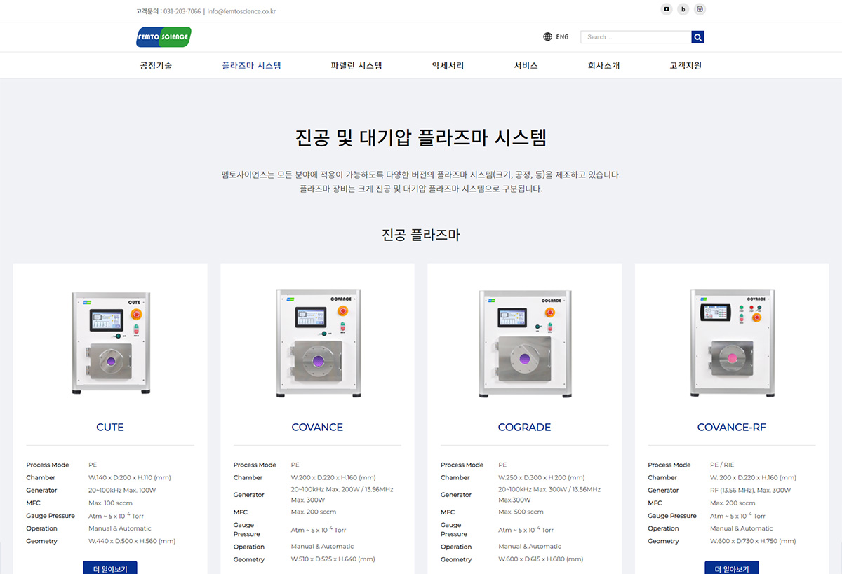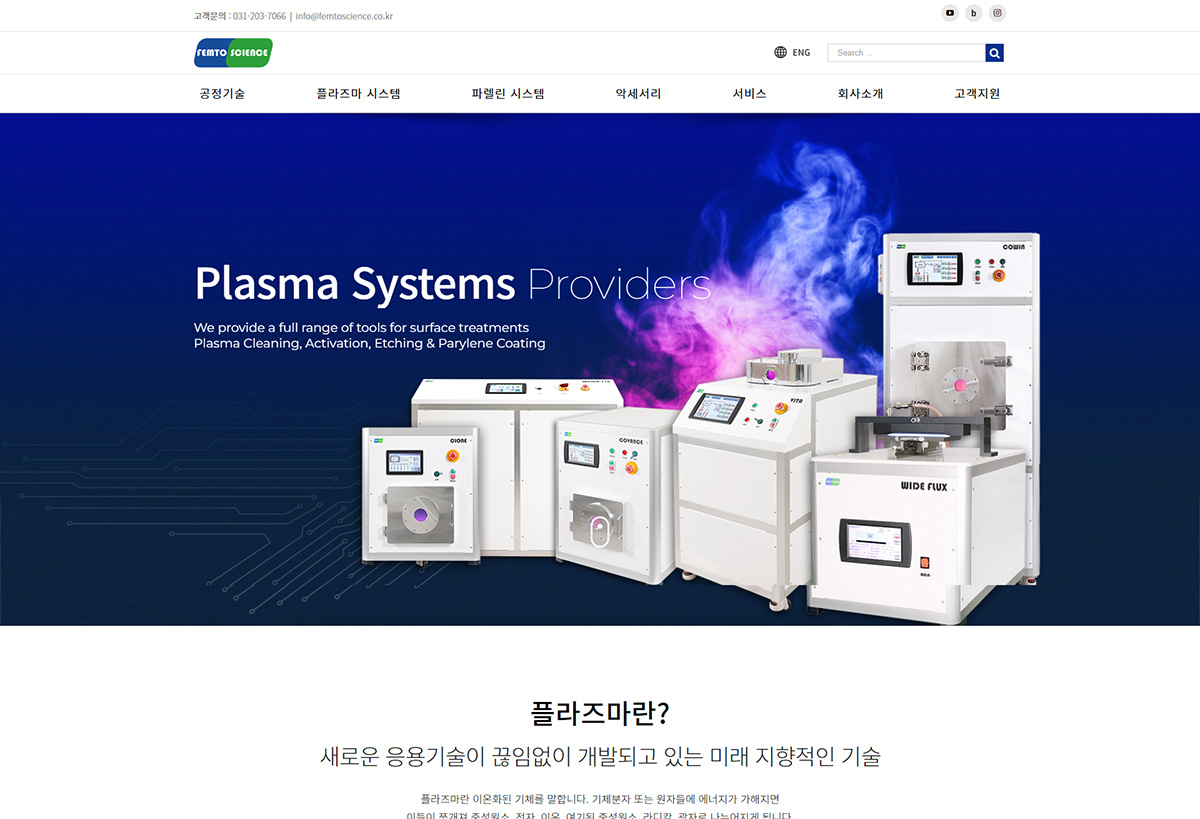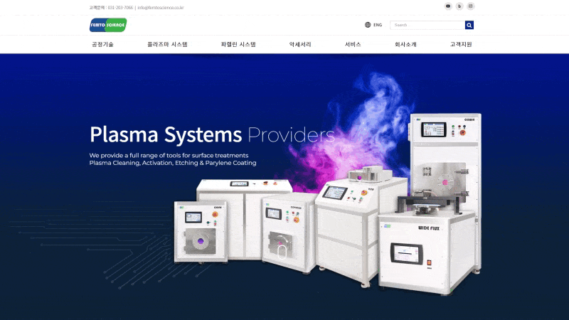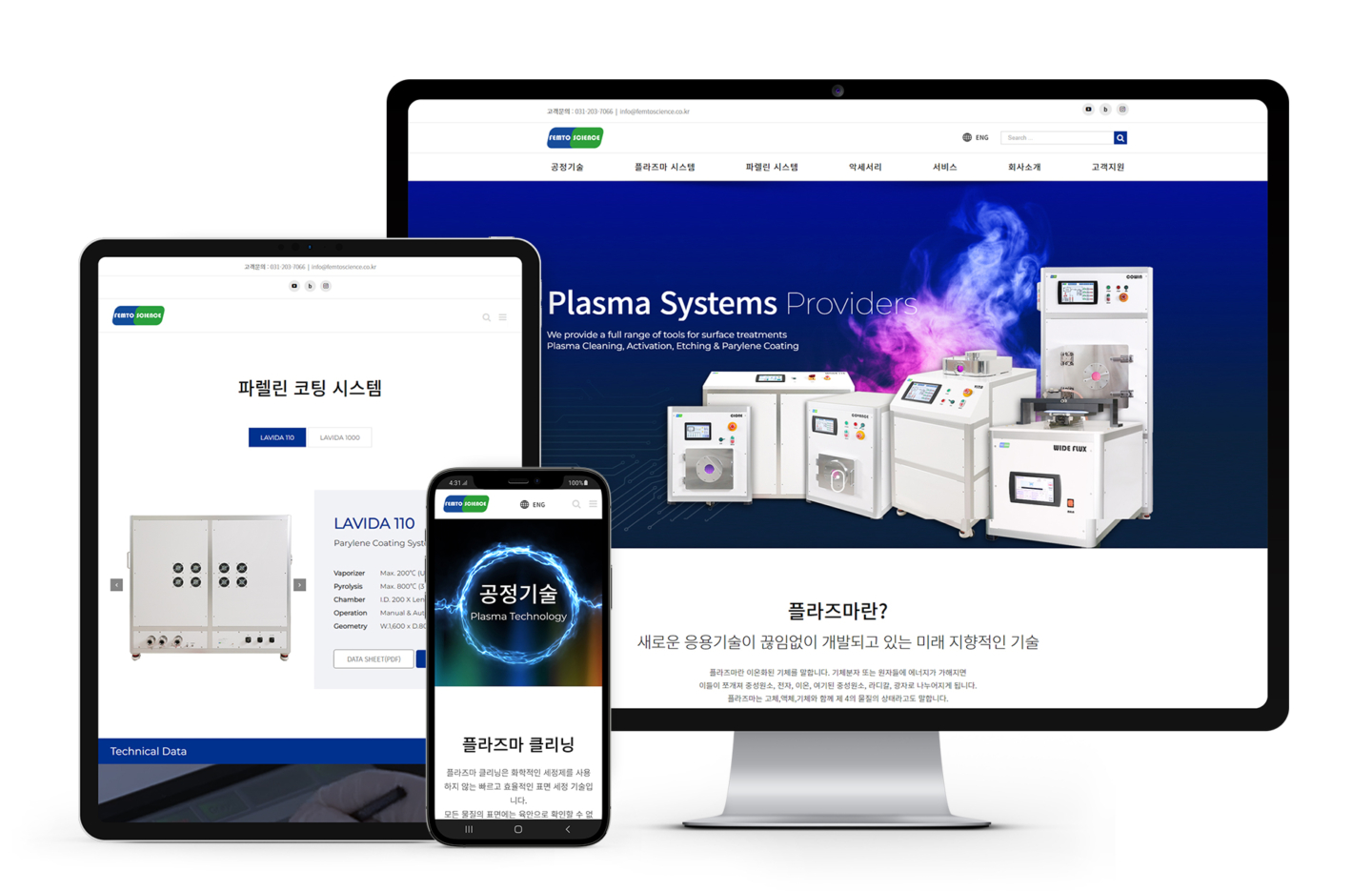펨토사이언스는 기본 소형 플라즈마 장비부터 대형 양산 플라즈마 장비 및 파릴렌 코팅 장비를 제조하는 전문기업입니다. 우리는 펨토사이언스에서 개발한 기술과 제품들에 대한 설명을 고객이 쉽게 이해하면서, 내용이 전달되는 데 중점을 두어 2개 국어의 반응형 웹을 개발하였습니다.