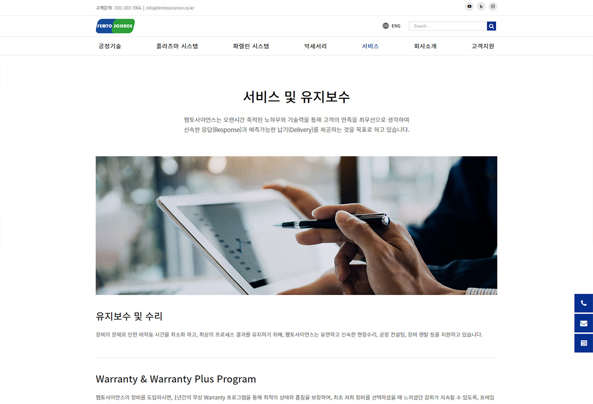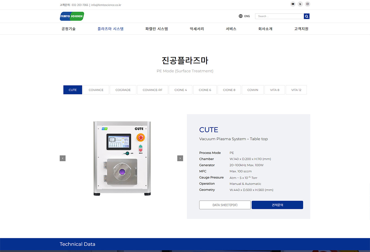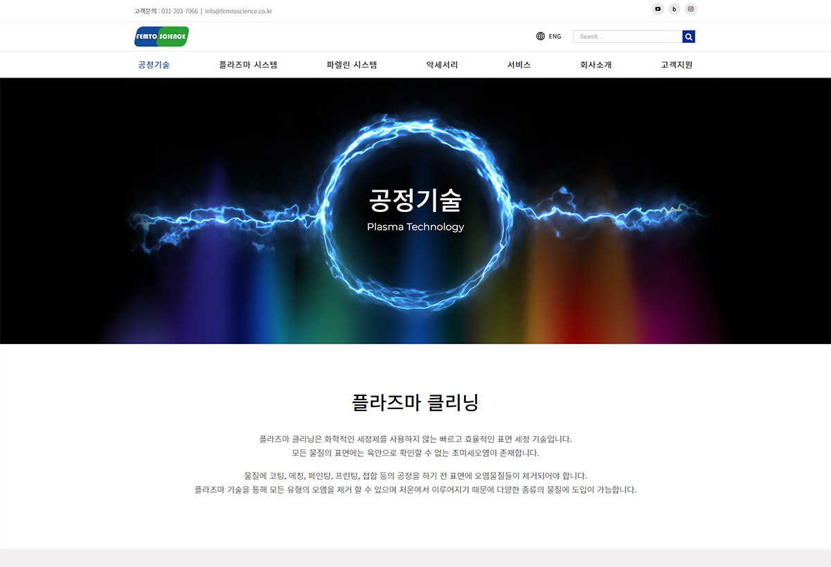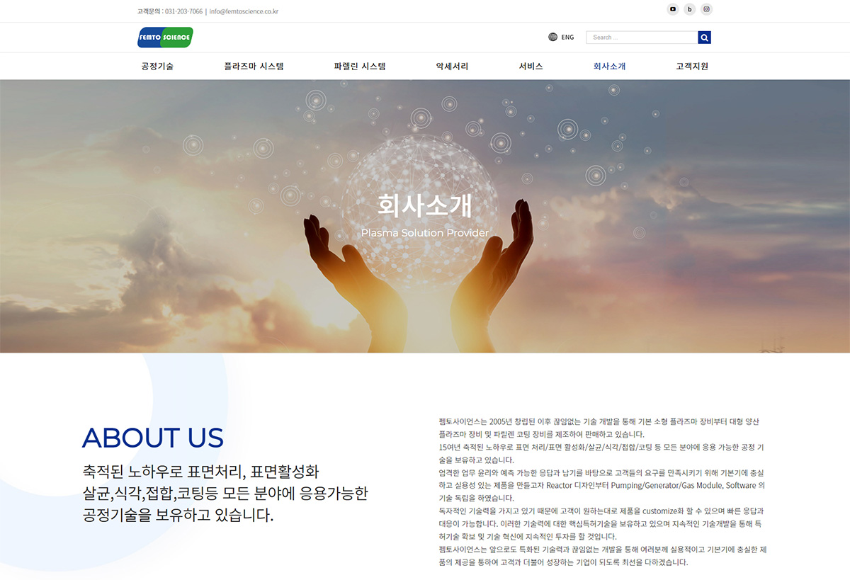 펨토사이언스는 기본 소형 플라즈마 장비부터 대형 양산 플라즈마 장비 및 파릴렌 코팅 장비를 제조하는 전문기업입니다. 우리는 펨토사이언스에서 개발한 기술과 제품들에 대한 설명을 고객이 쉽게 이해하면서, 내용이 전달되는 데 중점을 두어 2개 국어의 반응형 웹을 개발하였습니다.