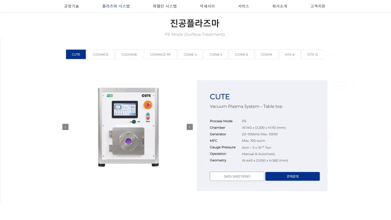 플라즈마 시스템, 파렐린 시스템, 악세사리 등 고객이 원하시는 제품을 쉽게 찾으실 수 있도록 카테고리로 구분하였습니다. 또한 제품의 스펙과 모든 면이 촬영된 실물 이미지를 확인하실 수 있어 제품의 구성과 설치 위치를 미리 예상하실 수 있도록 하였습니다.