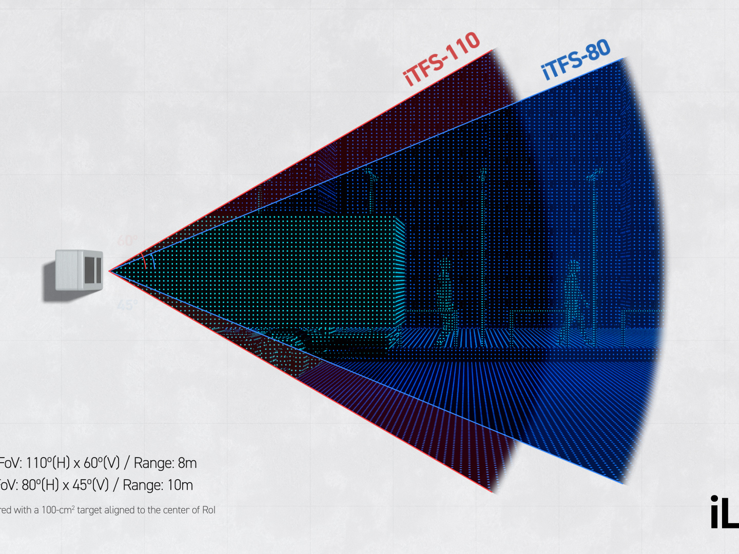 렌즈를 커스터마이징 할 수 있는 iLidar-ToF는 두 가지 타입으로 이루어져 있으며, 그 둘의 화각 차이가 얼마나 나는지에 대해 범위의 색상과 크기를 다르게 하여 시각적으로 표현하였습니다.