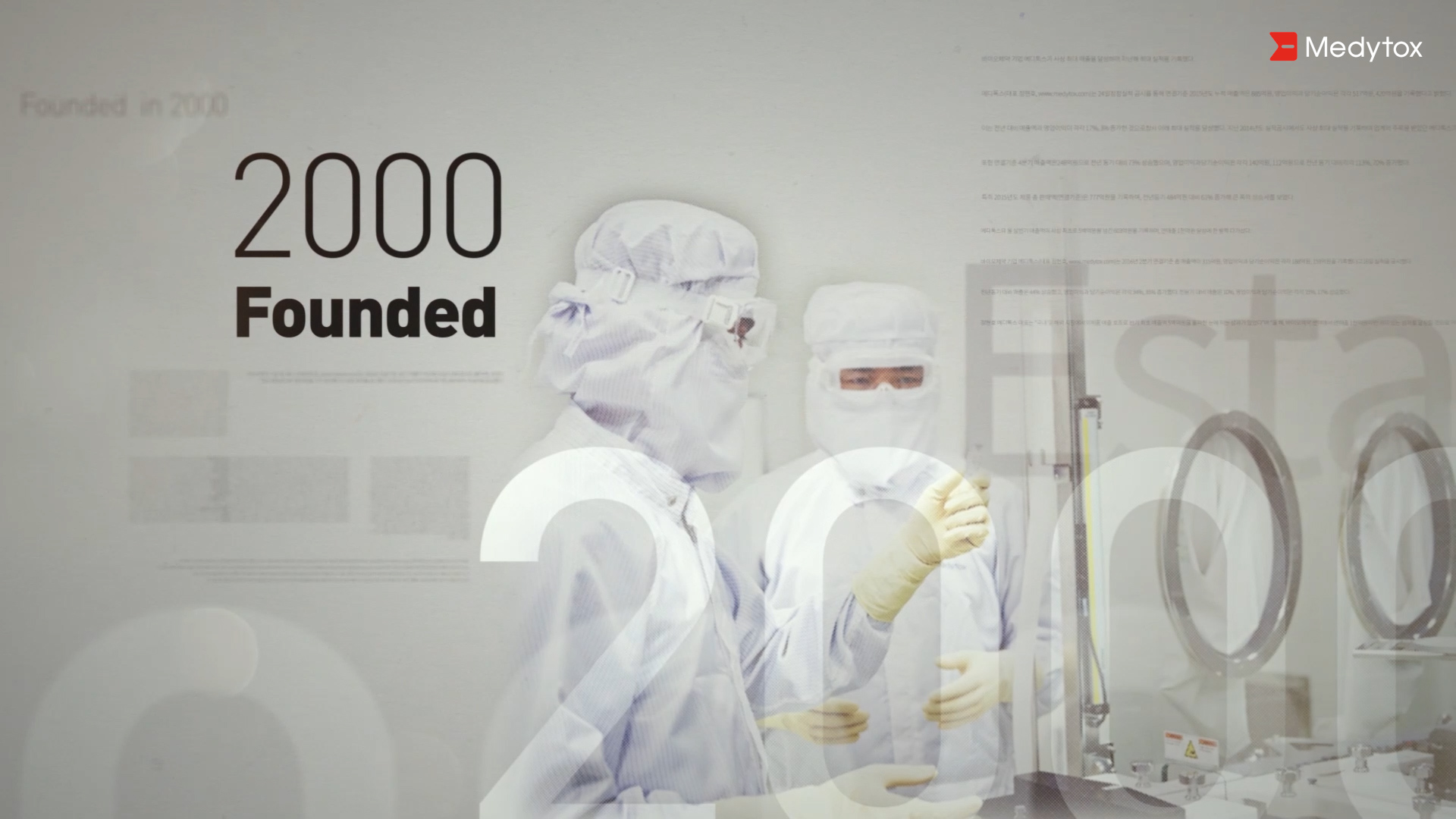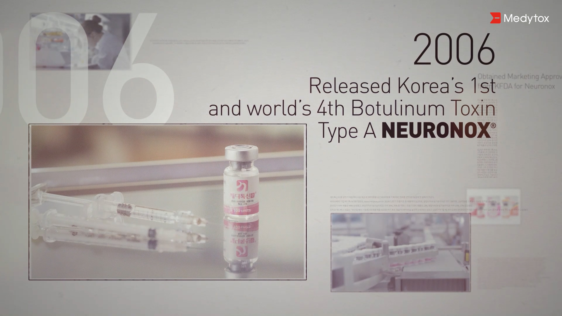 메디톡스의 연혁을 그래픽으로 시각화 시켜 변화 추세를 쉽게 파악할 수 있도록 하였고, 연구 개발하는 전문적인 모습을 분할로 자세하게 보여주어 업체의 신뢰감을 높였습니다.