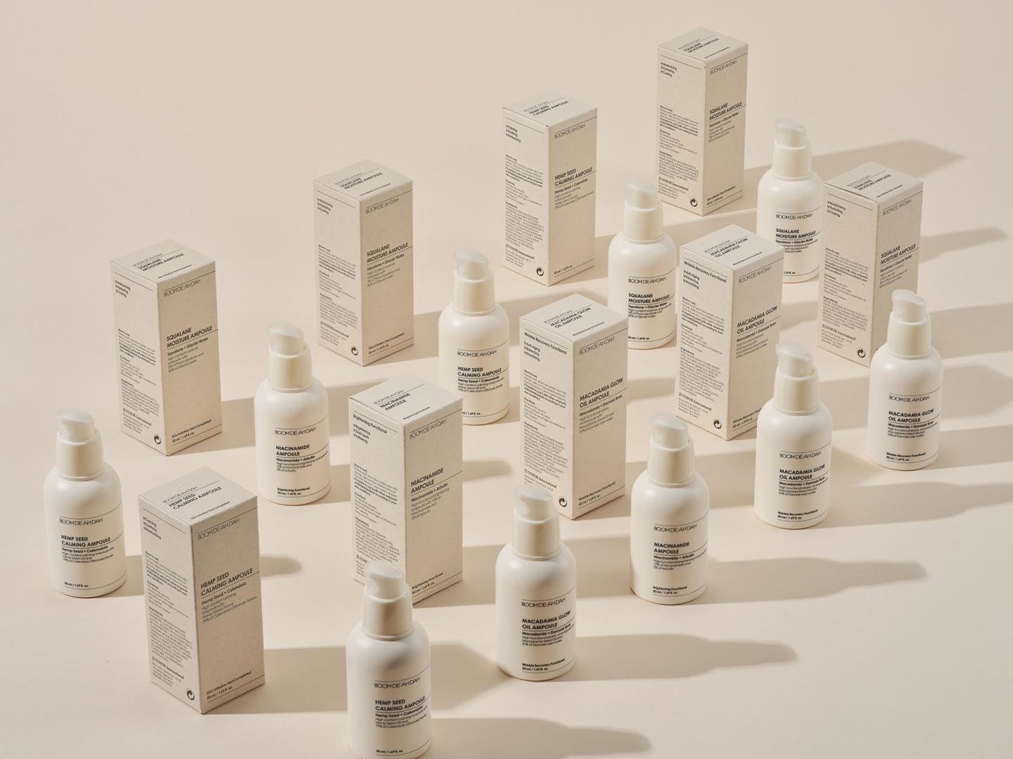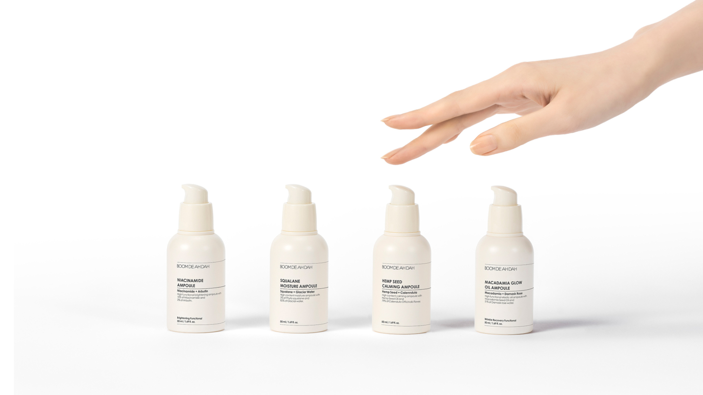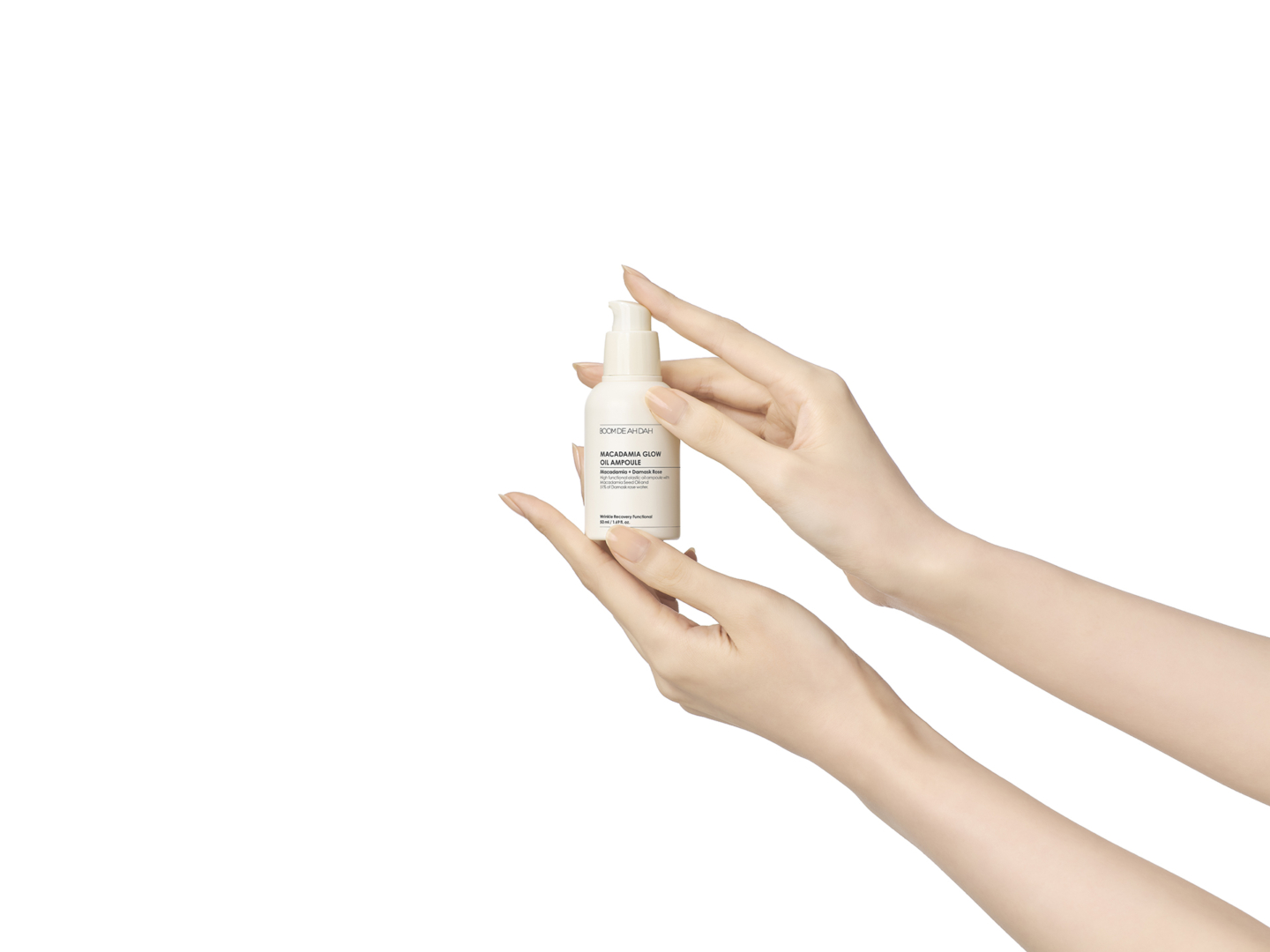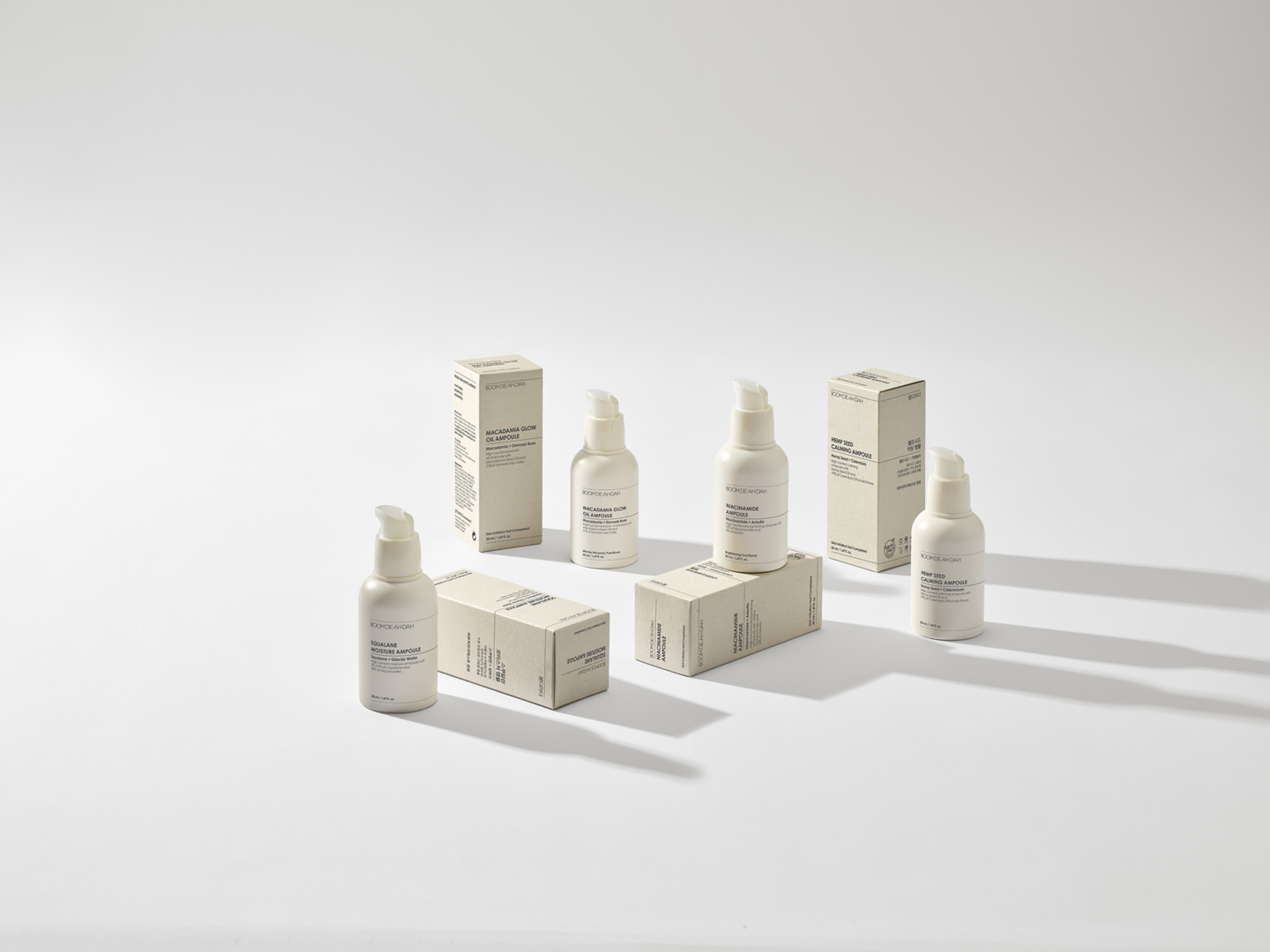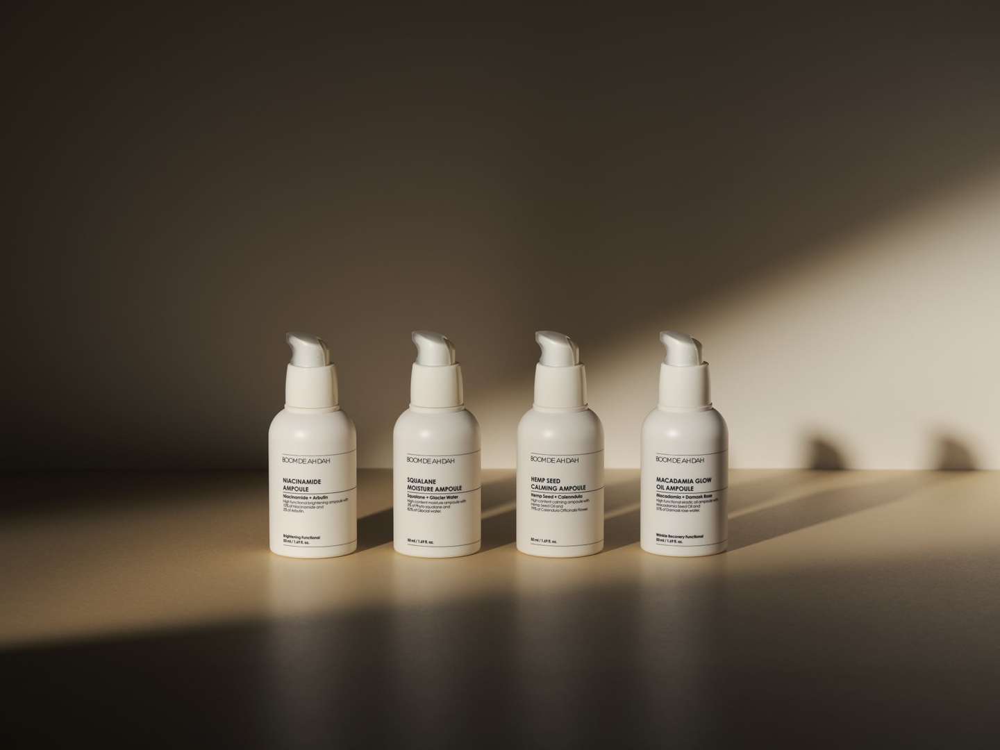 4종의 앰플을 토출한 후 롤링하는 장면, 흡수 시킨 상태에서의 손등 장면 그리고 가까이에서 제형을 보여주는 장면을 촬영하여 제품의 점도나 택스처감을 자세하게 보여주었습니다.