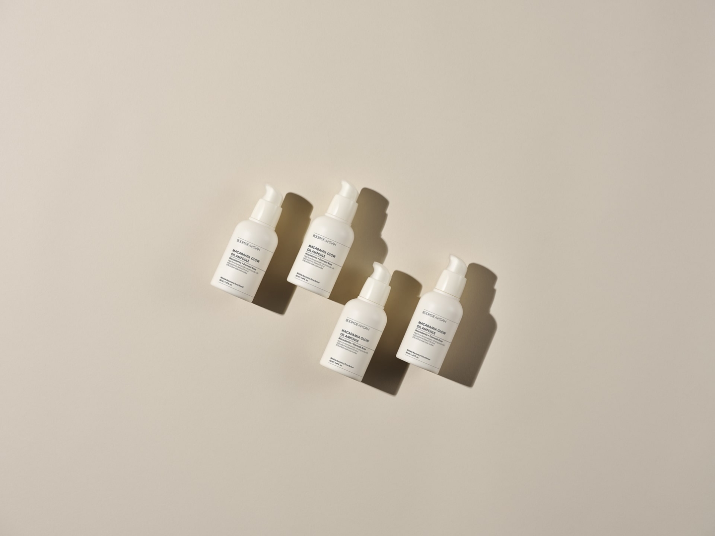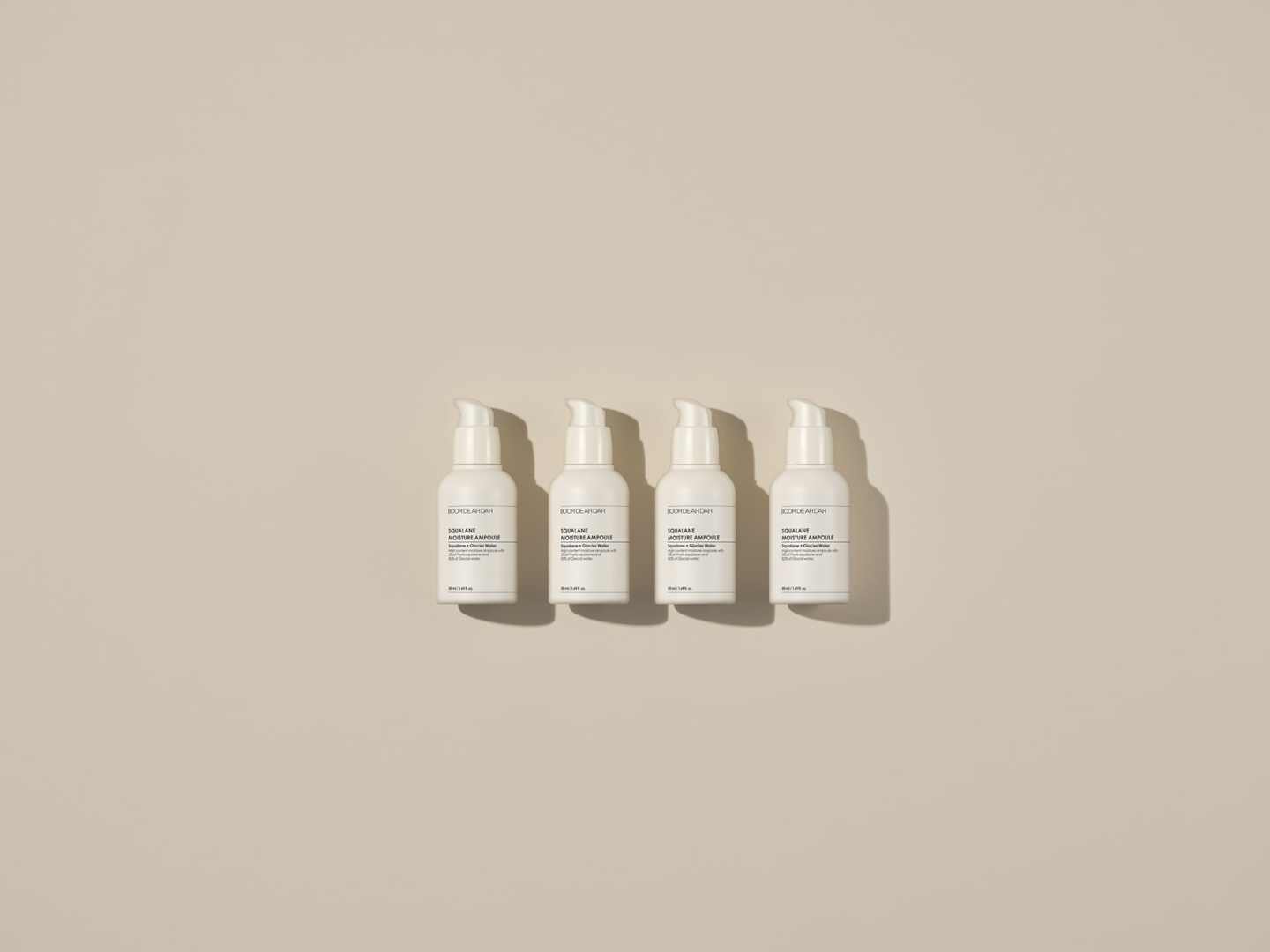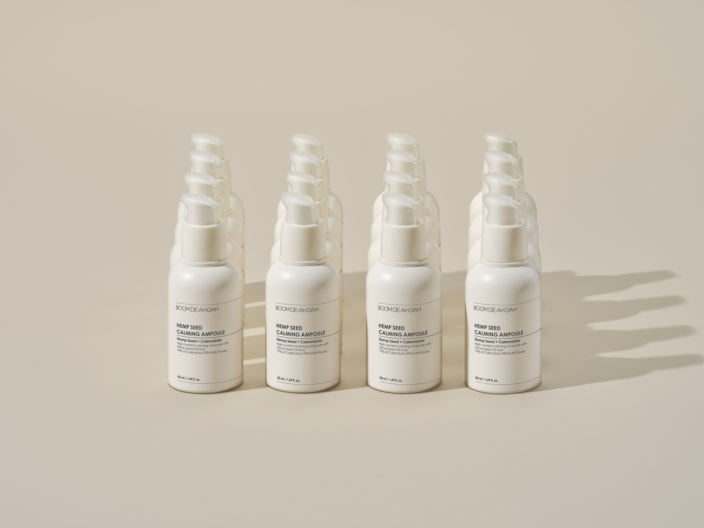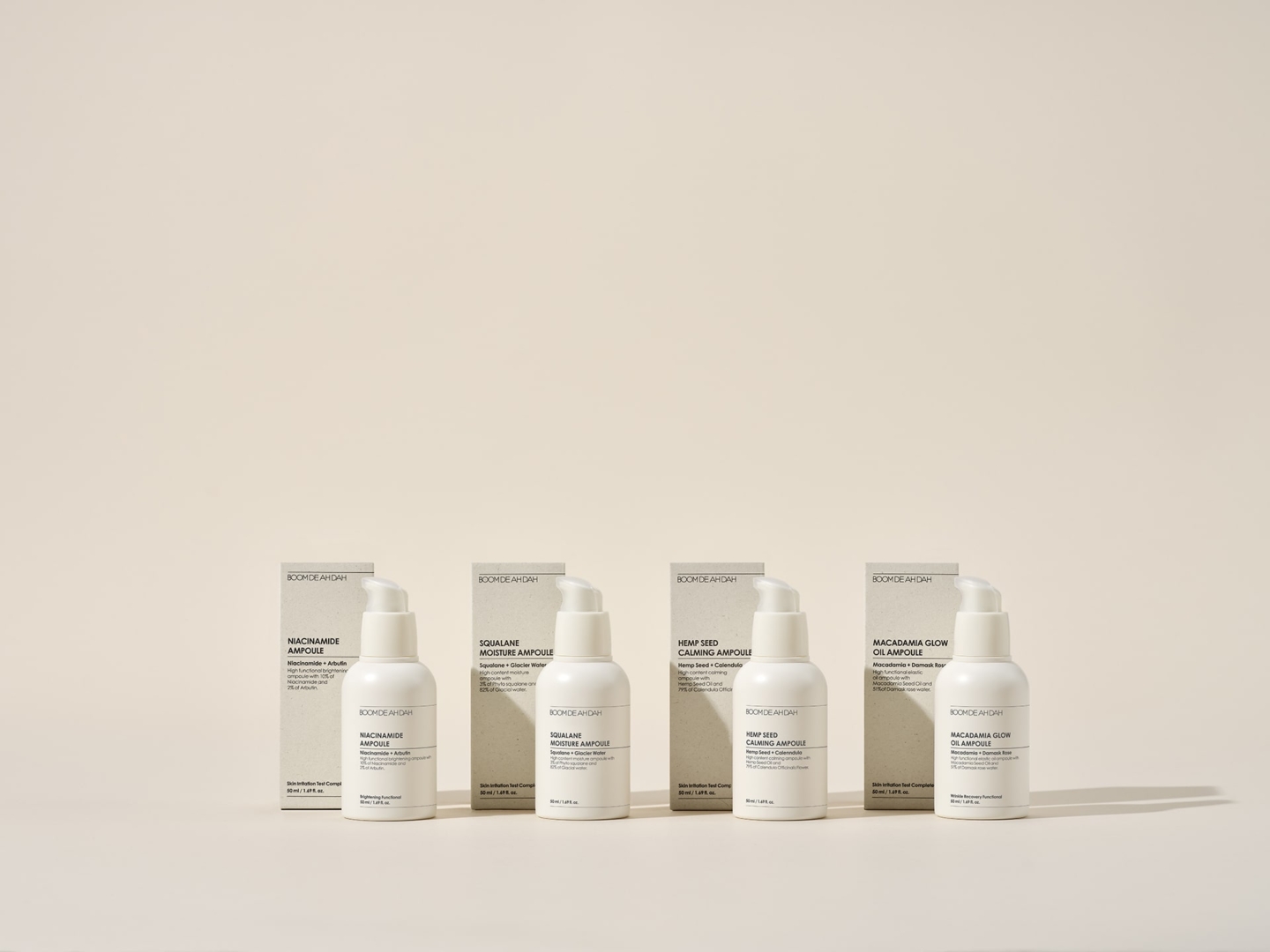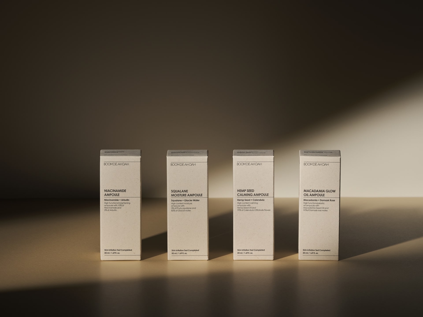 4종의 제품 단상자와 용기를 정렬로 배치하여 하이앵글과 아이앵글로 제품의 모습을 담았습니다. 제품과 비슷한 베이지 색상을 배경으로 사용하여 부드럽고 따뜻한 느낌을 주었습니다.