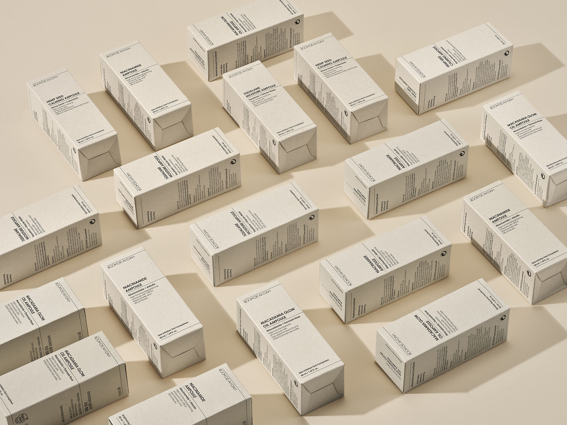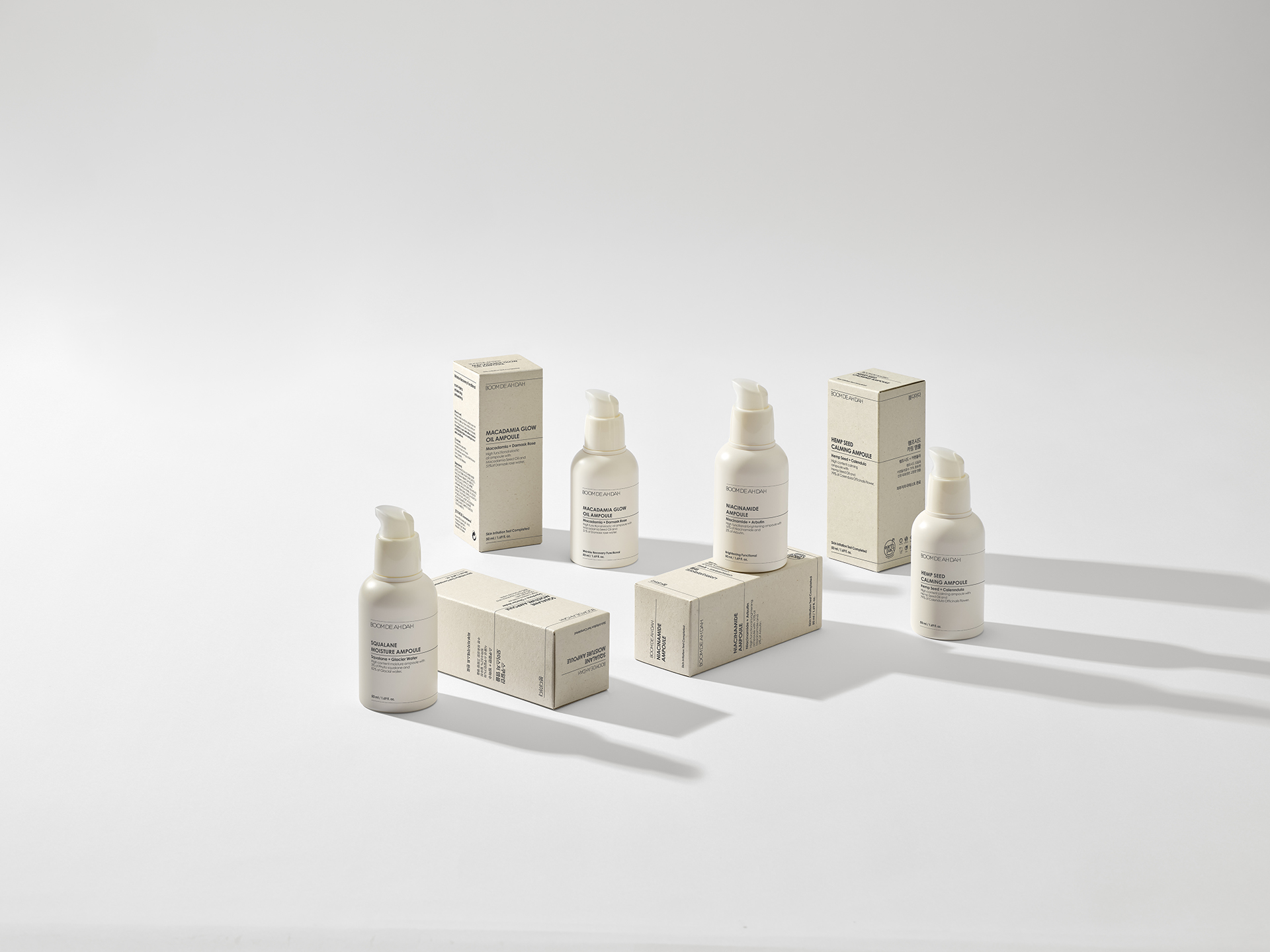 4종의 제품 단상자와 용기를 정렬로 배치하여 하이앵글과 아이앵글로 제품의 모습을 담았습니다. 제품과 비슷한 베이지 색상을 배경으로 사용하여 부드럽고 따뜻한 느낌을 주었습니다.