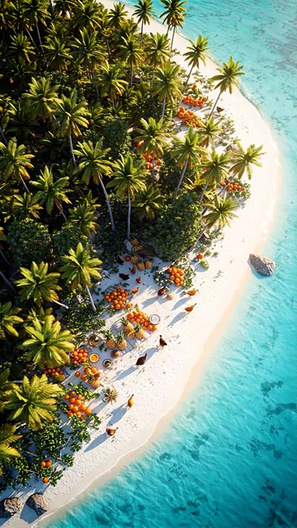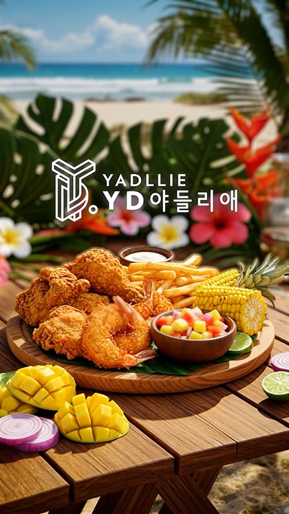 야들리애의 메뉴인 알로하 플래터를 소개하는 20초 내외의 AI 영상입니다. 푸른 바다와 야자수, 모래사장에서 펼쳐지는 여름 휴양지의 분위기를 담아내어 알로하 플래터가 선사하는 즐거움과 이국적인 감성을 유니크하게 연출하였습니다.